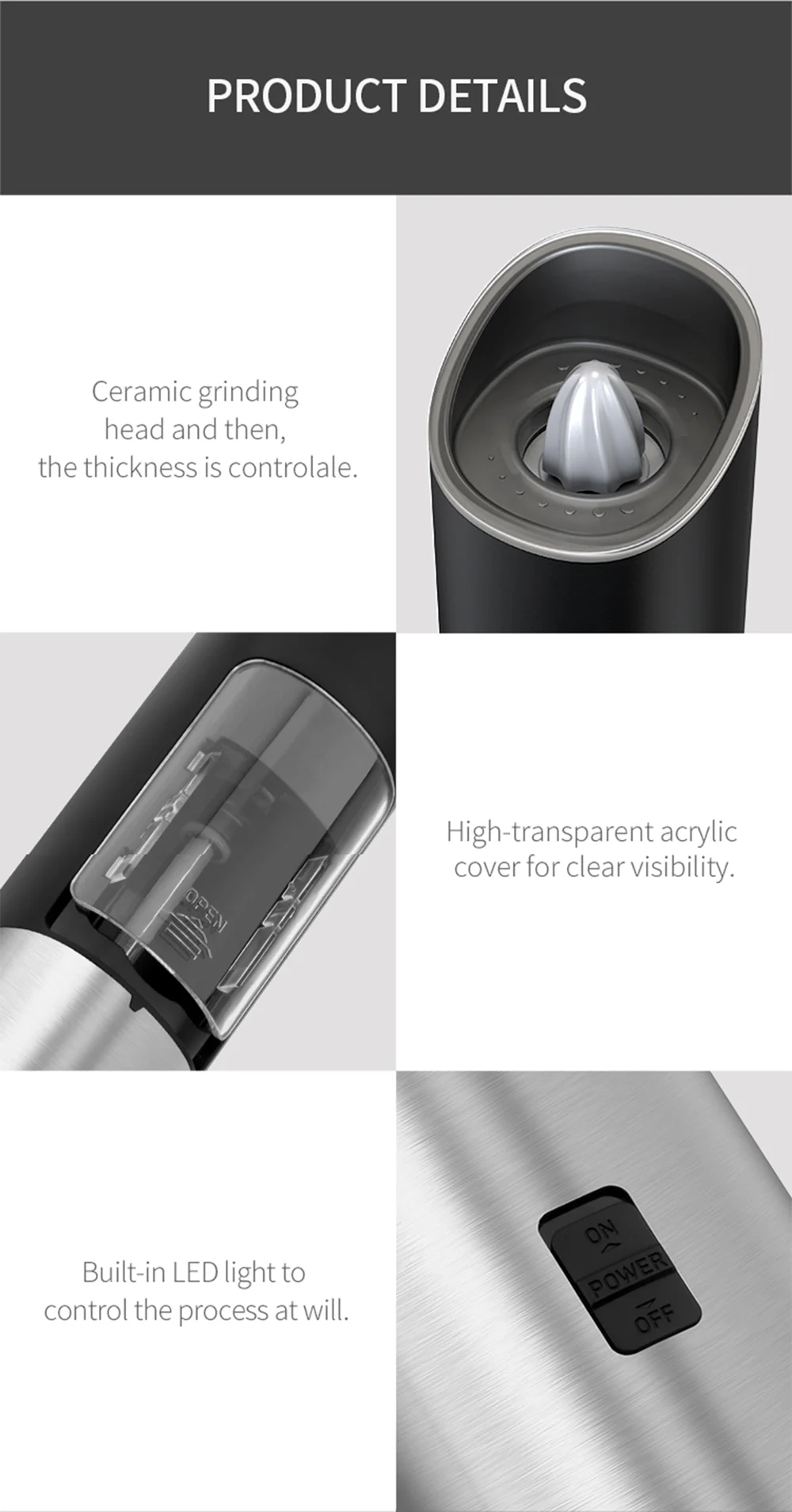【Gravity шлифовальный станок с светодиодный светильник 】Электрическая шлифовальная машина для перца разработана с переключателем гравитационного датчика. После того как вы инвертируете мясорубку, она будет измельчать соль, перец или другие приправы автоматически, синий светодиодный светильник также будет активирован одновременно. Нажмите кнопку, когда стиль кнопки используется, и она будет автоматически измельчать соль, перец или другие приправы.