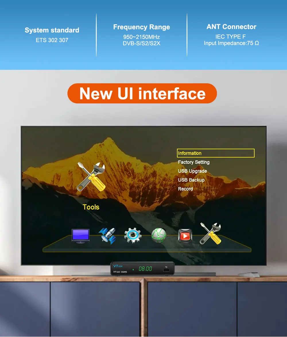 V7S5X-это спутниковый ТВ-приемник, это глобальная версия, с новейшим цифровым спутниковым ТВ стандартным DVB-S2X и декодированием видео H.265.