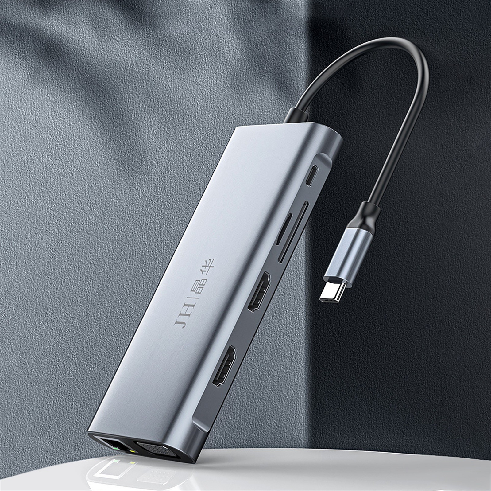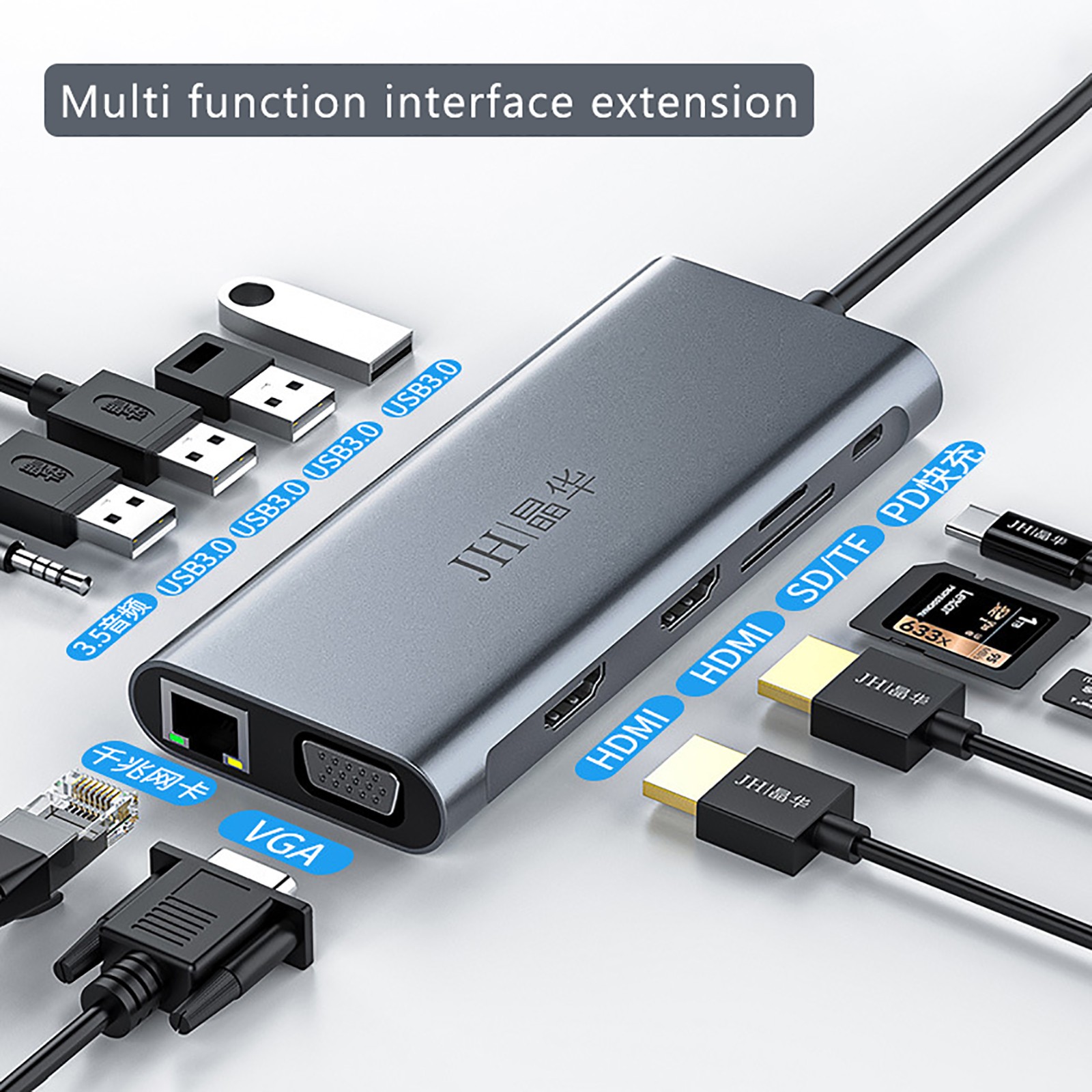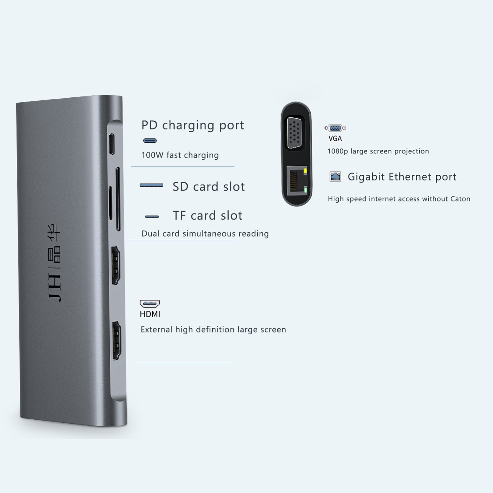 12 смарт-портов расширения: соответственно RJ-45 порт, C-type PD порт зарядки, 4 USB 3.0 портов, 2 4K Разрешение HDMI видео выход, VGA и Micro SD и TF кард-ридер (слот для sd-карт и слот для tf-карт можно использовать на концентраторе одновременно)
