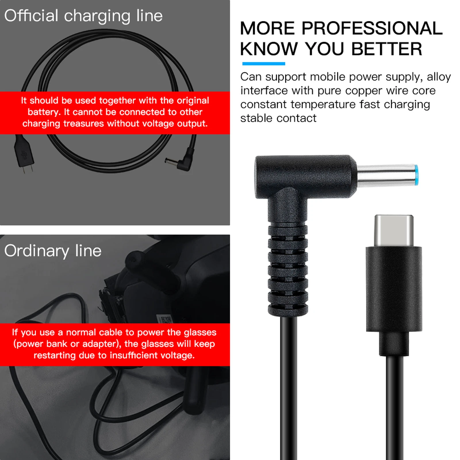 2. Поддерживает различные мобильные источники питания: с помощью кабеля питания очков, вы можете легко подключиться к основным мобильным источникам питания на рынке для питания Goggles2 очков.