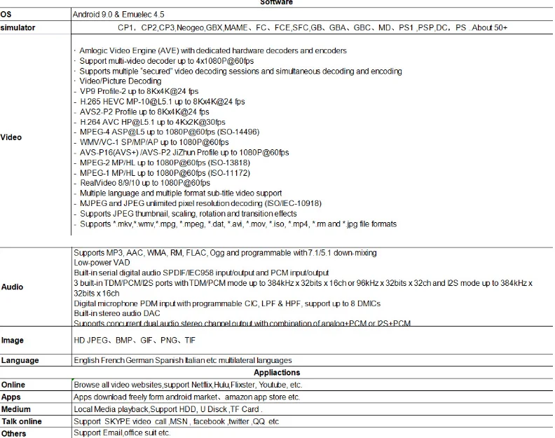 Симулятор: CP1,CP2,CP3,Neogeo,GBX,MAME,FC,FCE,SFC,GB,GBA,GBC,MD,PS1,PSP,DC,PS .. около 50