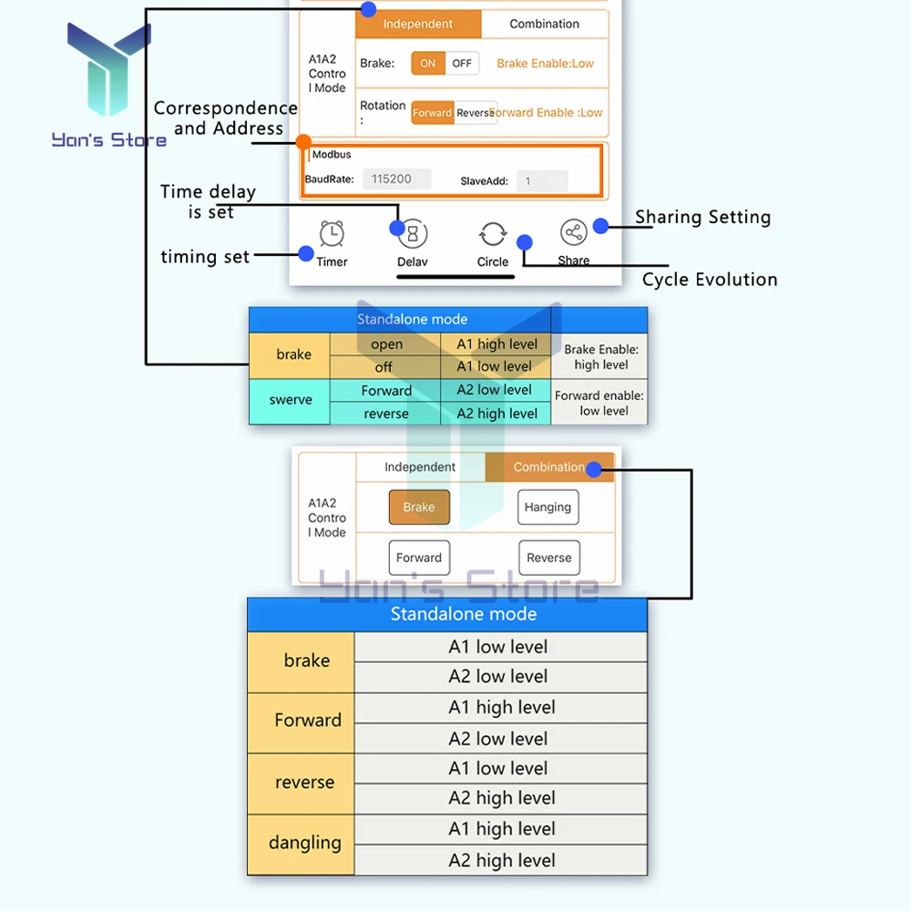 Такие функции, как вращение вперед и назад и торможение, очень масштабируются. После подключения к нашему wifi модулю, вы можете дистанционно управлять вперед и назад вращение и торможение двигателя через мобильный телефон APP.