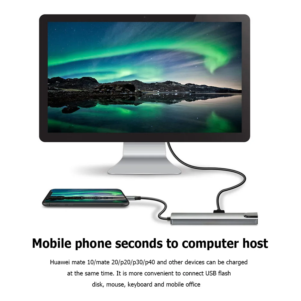 4. Современный дизайн и сильная совместимость:Материал из алюминиевого сплава позволяет избежать повреждений, ускоряет рассеивание тепла и обеспечивает большую защиту док-станций для ноутбуков и других устройств. Многопортовый концентратор Type-C экономит хлопот от многократного подключения и отключения, а также расширяет возможности вашего ноутбука на ходу. Маленький и легкий, он очень удобен для работы, путешествий или деловых поездок. Элегантные цвета и приятный внешний вид подходят для вашего ноутбука.