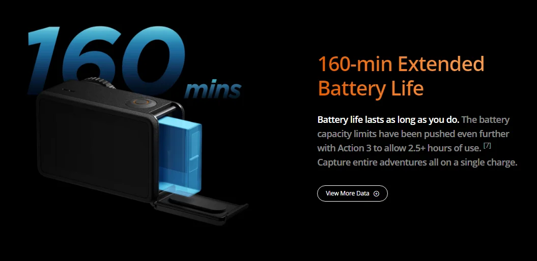 Прекратите ждать мощности. Действие 3-это первая Экшн-камера, которая изначально поддерживает технологию быстрой зарядки. Всего за 18 минут, он может быть приведен в действие до 80%, [8], что достаточно для примерно двух часов съемки. [8]