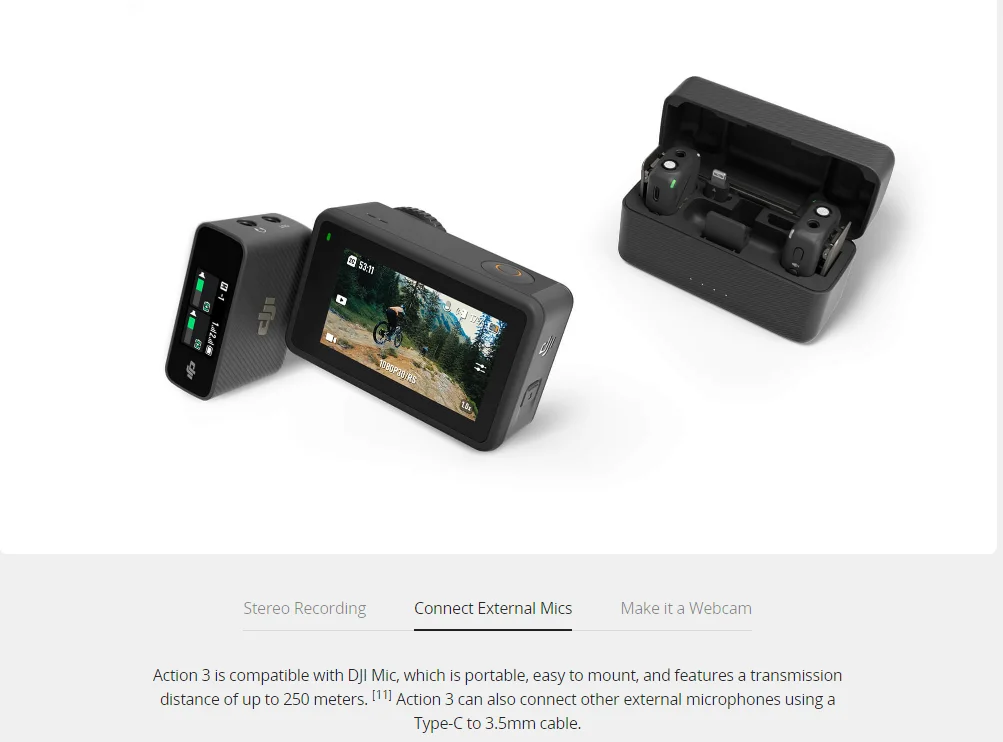 Действие 3 Совместимо с DJI Mic, который является портативным, легко монтируется и имеет дальность передачи до 250 метров. [11] Гарри Поттер 3 может также подключить его к другому внешнему микрофоны с помощью Тип с разъемами типа C и 3,5 мм кабель.