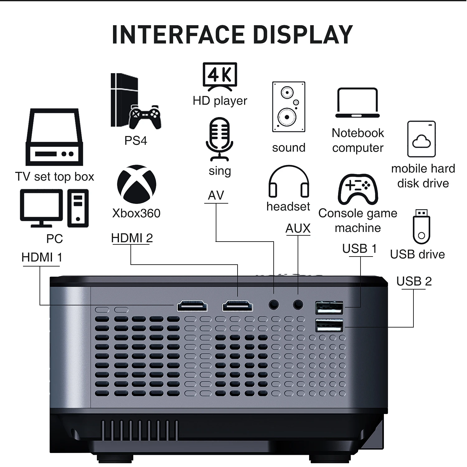 Описание на английском языке: 1080P кемпинговый проектор A9