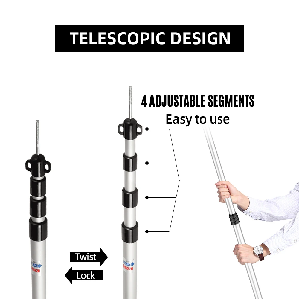 4 секции дизайн с удобной регулировкой от 0,9 m (2.9ft) до 2,8 м (9.2ft) для того, чтобы соответствовать различным палатки.