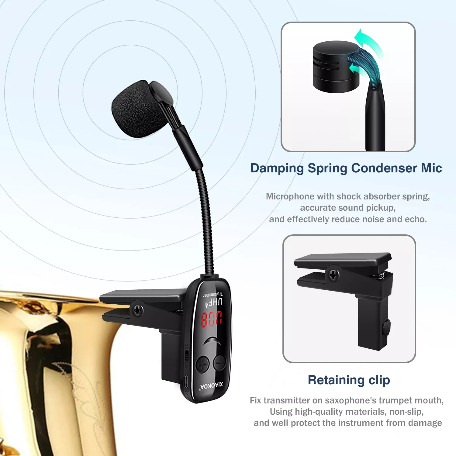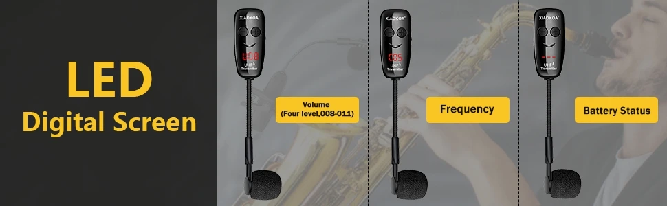 【 Светодиодный цифровой экран 】беспроводной инструмент микрофон с светодиодный цифровой экран, который может видеть частоту/мощность батареи и громкость esaily▶Вращающийся на 360 градусов силиконовый ударопрочный зажим и крепкий стальной зажим для воротника позволяют легко закрепить на инструментах или воротнике. Он может эффективно фильтровать шум, создаваемый вибрацией инструмента.