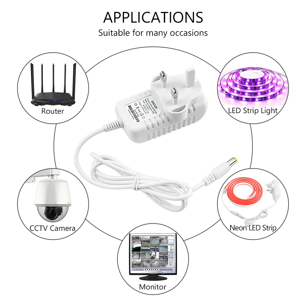 Используется в светодиодный светильник, роутерах, охранной индустрии видеонаблюдения, CCTV камере, cd-плеере, VCD плеере, портативных игровых машинах, беспроводном маршрутизаторе, ADSL модеме, хабе, аудио/видео системе, радиосистемы и другие электронные продукты DC 12V.