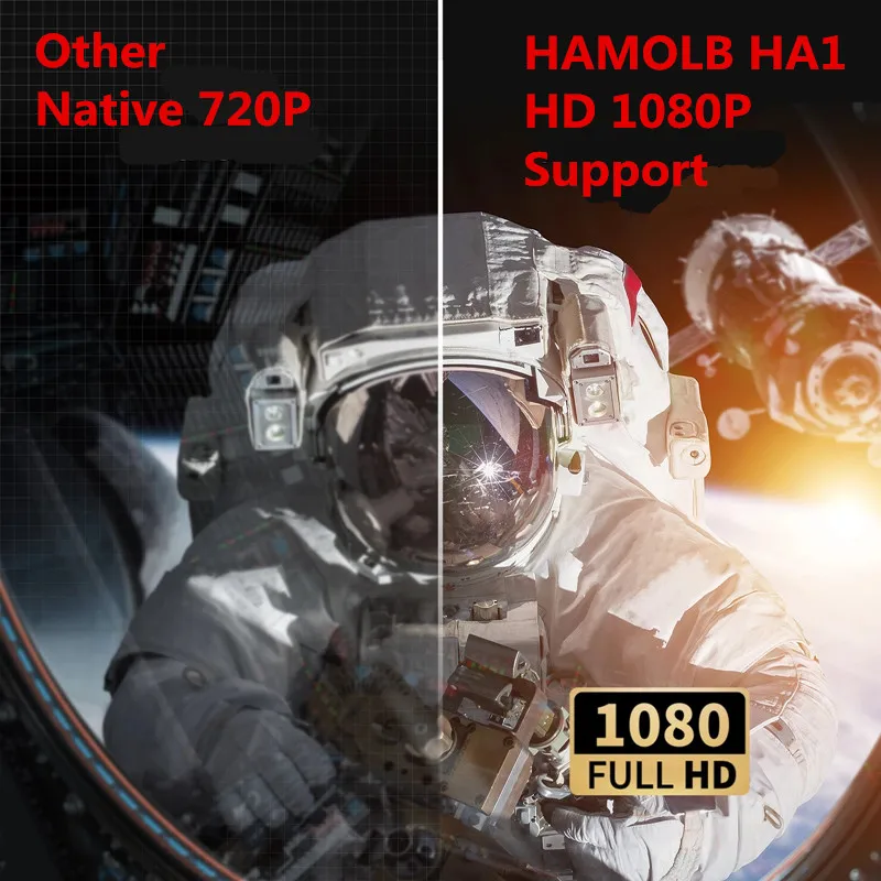 [HD видеопроектор высокой яркости]:Проектор HAMOLB HA1 в 3 раза ярче других мини-проекторов по той же цене. Мы не предоставляем Ложные параметры, только реальные и эффективные. Поддержка до 1080P, обеспечивает невероятно яркое изображение для видео и фильмов, вы можете наслаждаться счастливым временем с семьей или друзьями дома или на открытом воздухе.