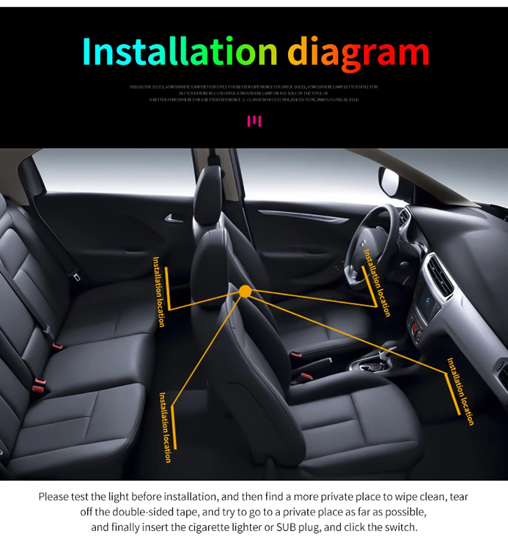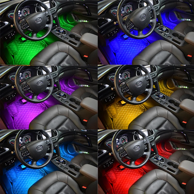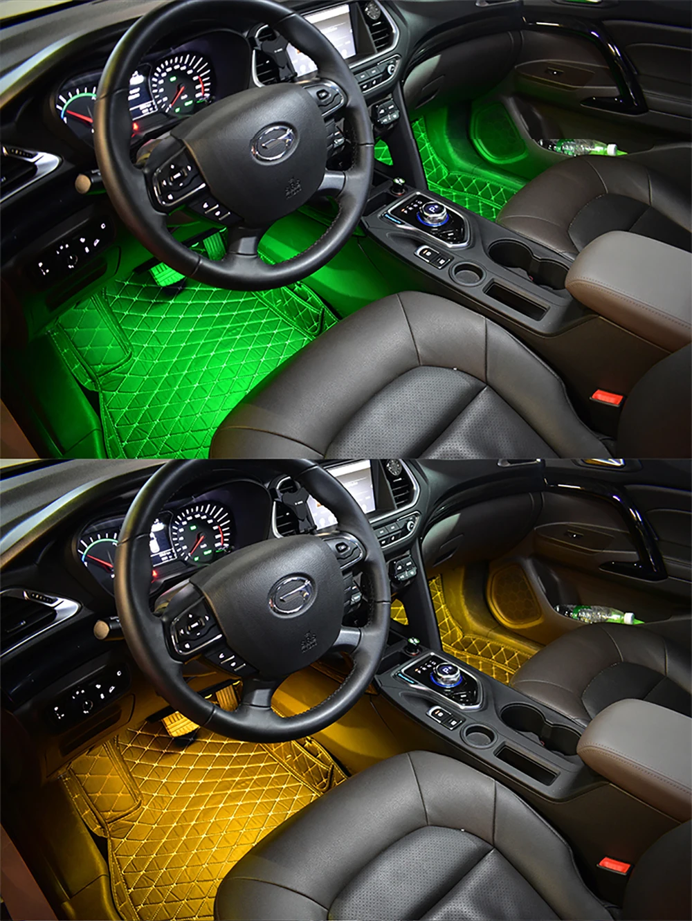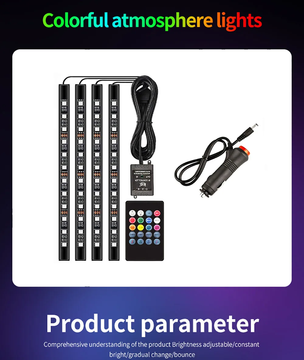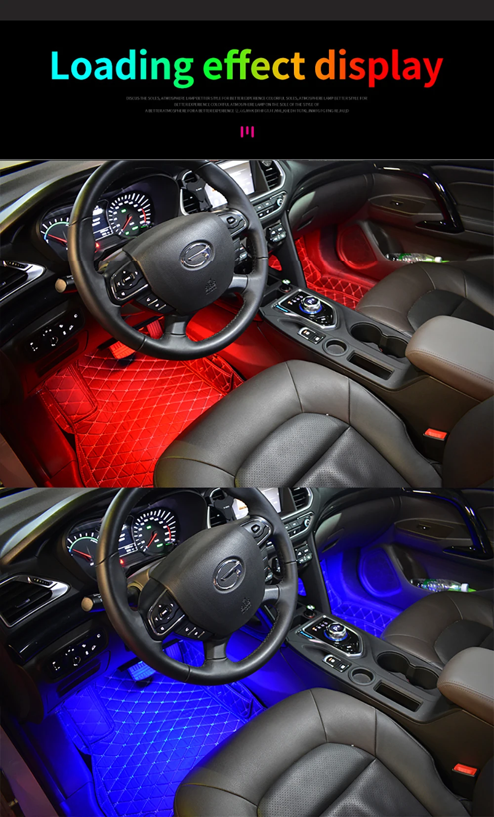 1.RGB атмосферная лампа/ножная лампа, создает очаровательную атмосферу для вас, экзотический и романтичный интерьер. Освещает весь интерьер автомобиля.
