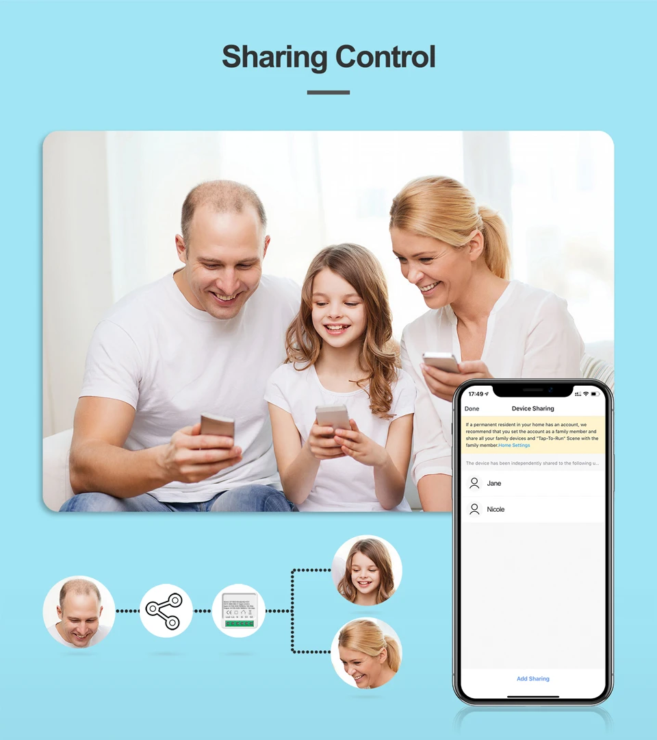 Основная учетная запись может быть предоставлена другим членам семьи, а функции и настройки полностью сохранены и скопированы; Безопасность: как только лампа будет добавлена основной учетной записью, лампа будет и другие пользователи больше не могут найти и добавить; Его необходимо активно делиться, прежде чем другие смогут использовать его.