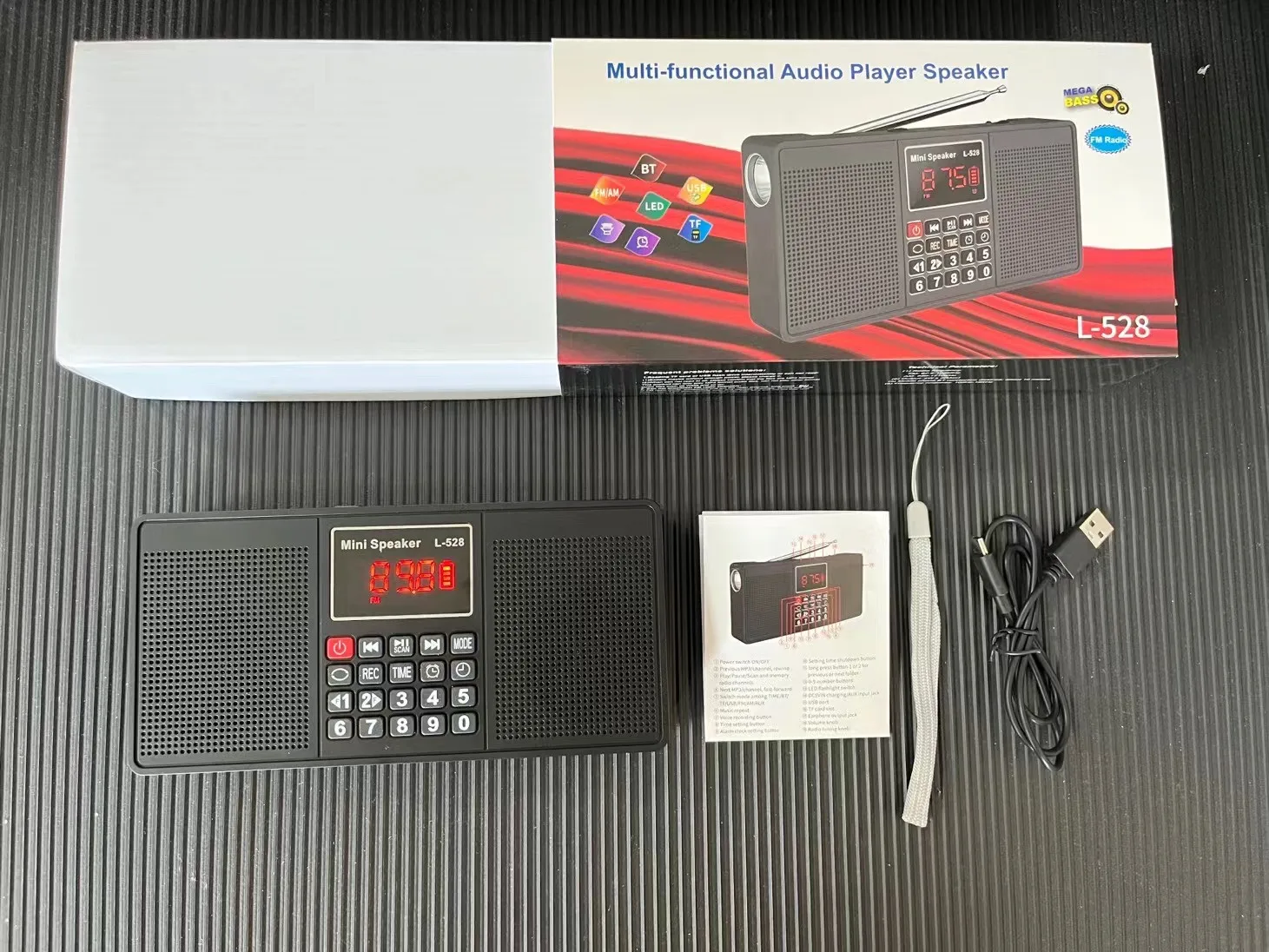 Новая модель полноразмерных функций!Модель: L-528Основные функции: Bluetooth,AM,FM,TF,USB,Handsfree,AUX, фонарик, Recoridng,Colock, будильник, настройка отключения времени, выбор папки, автоматическая/ручная ручка...Размер изделия: 18,8*9,1*3,2 смВес воздуховода: 322 гЦвет: черный, серый, золотой, серебряный