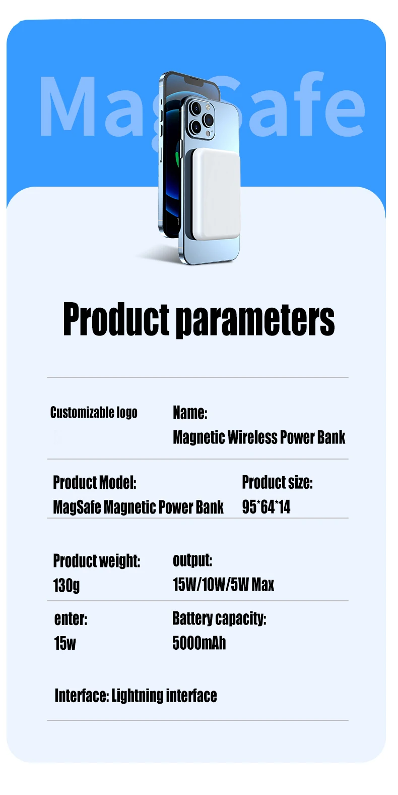 Емкость аккумулятора увеличена до 5000 мАч. Зарядная мощность светового интерфейса составляет 18 Вт, зарядная мощность мобильный телефон, подключенный к источнику питания, составляет 15 Вт, а Беспроводная зарядная мощность мобильный телефон-5 Вт.