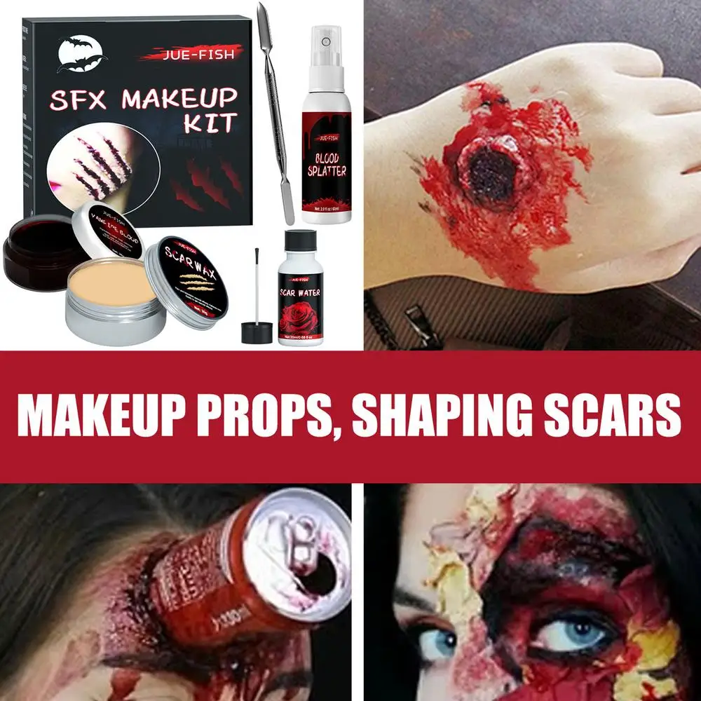 5. Идеальный подарок на Хэллоуин: в упаковке 1*30 г воска для кожи, 1*30 г поддельного геля для крови, 1*60 мл поддельный спрей для крови, 1*20 мл шрам для воды, 1 * двусторонний шпатель для помощи в нанесении воска, 3 * губки, идеальный макияж для Хэллоуина, чтобы помочь вам создать идеальный макияж для Хэллоуина.