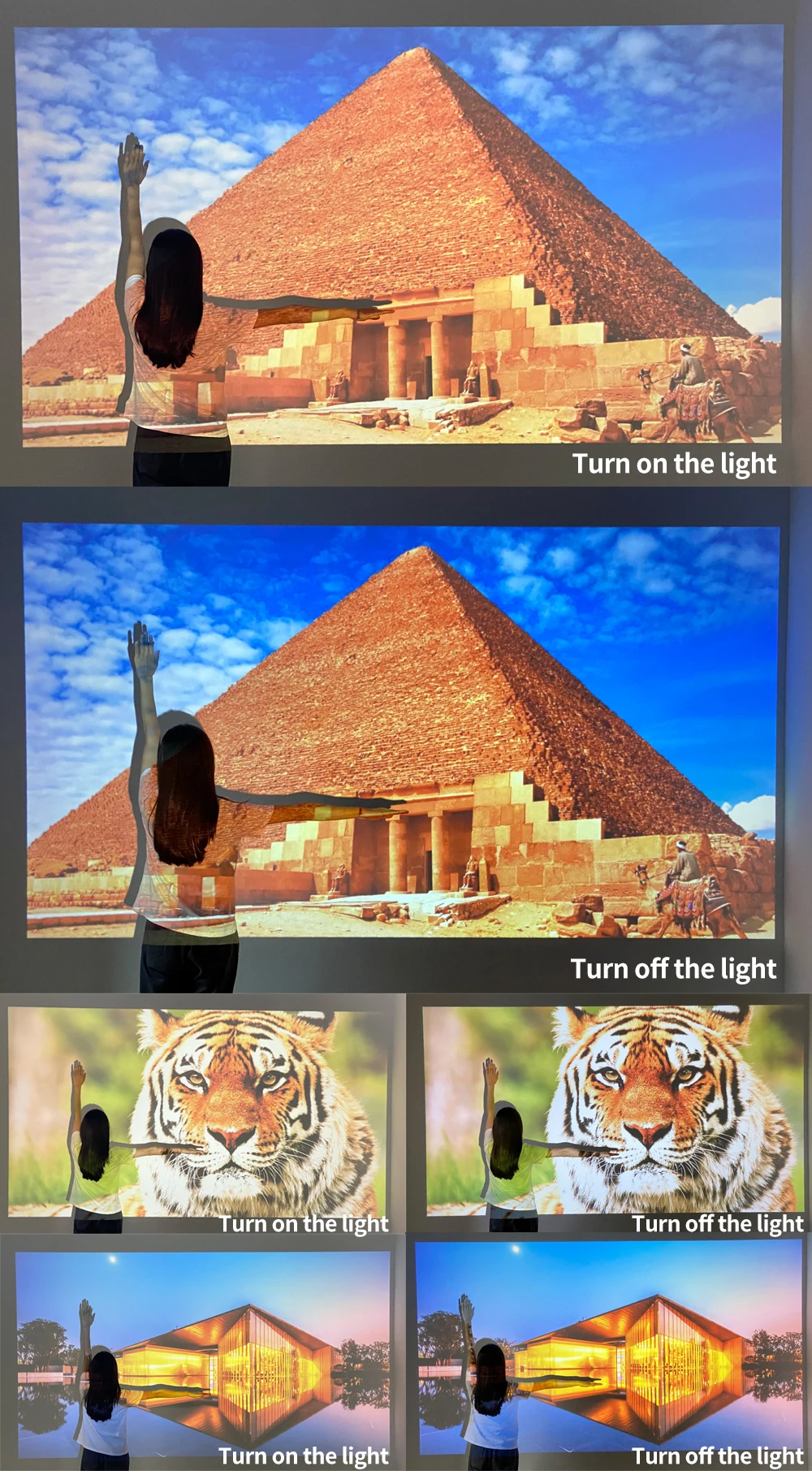 120 дюймов проекция, сравнение эффект включения и выключения света. (Фото сделано с помощью Iphone 11 Pro)