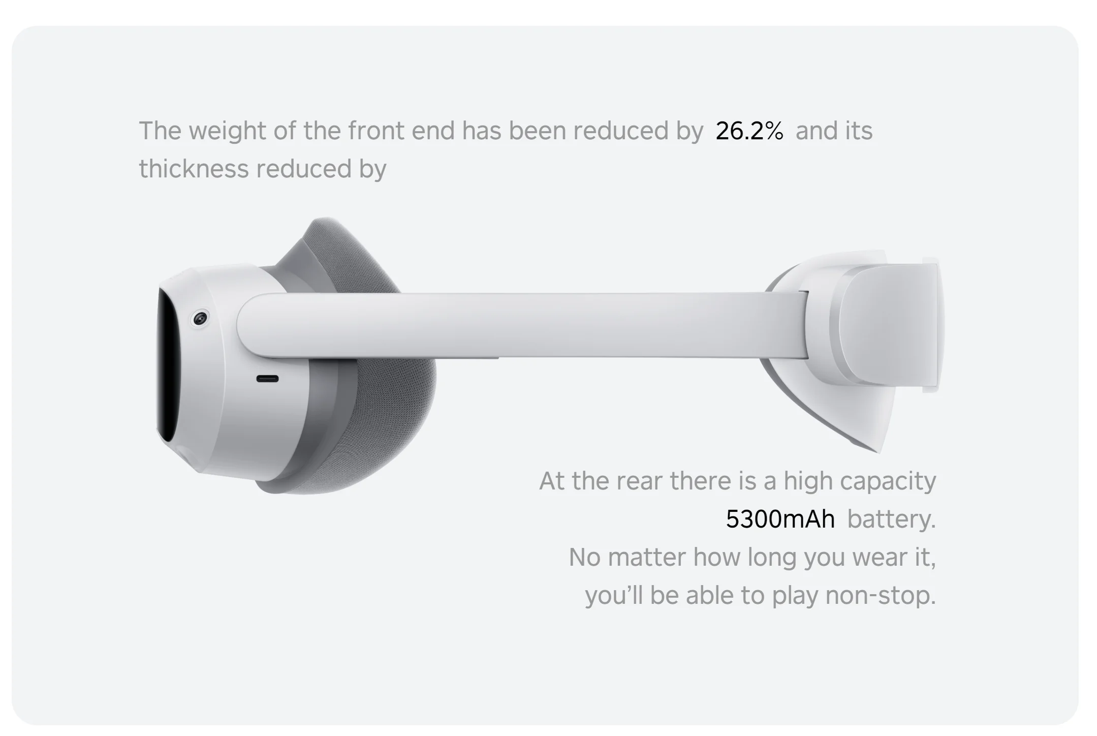 Сбалансированная конструкция означает, что вес PICO 4 равномерно распределяется спереди и сзади. Центр тяжести плотно прилегает к лицу. Задняя часть имеет мягкую опору. В результате очень удобная посадка. Передняя часть не наклоняется, а задняя не скользит вниз. Он очень стабильный.