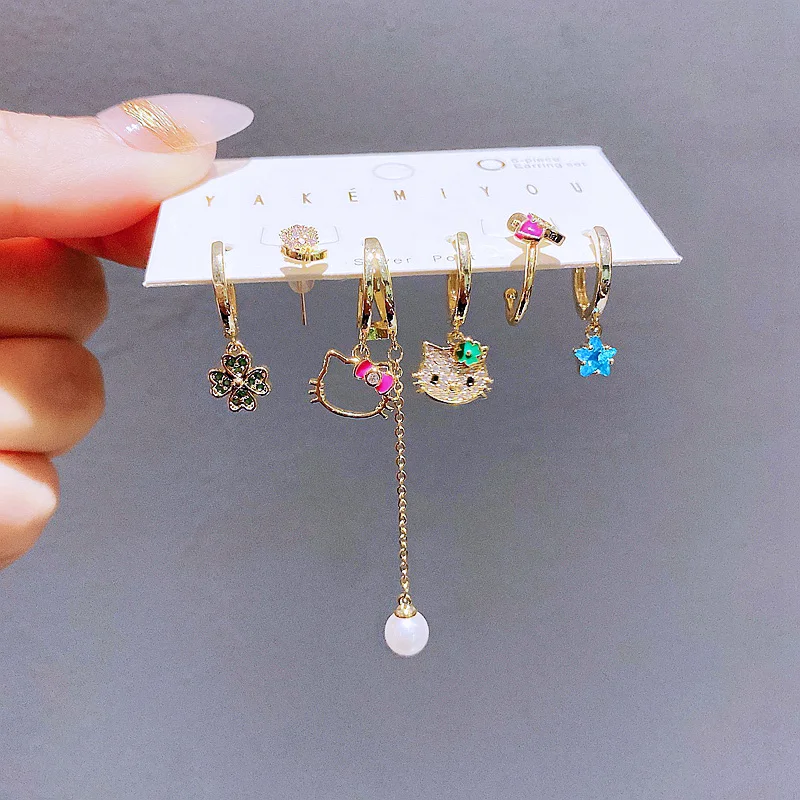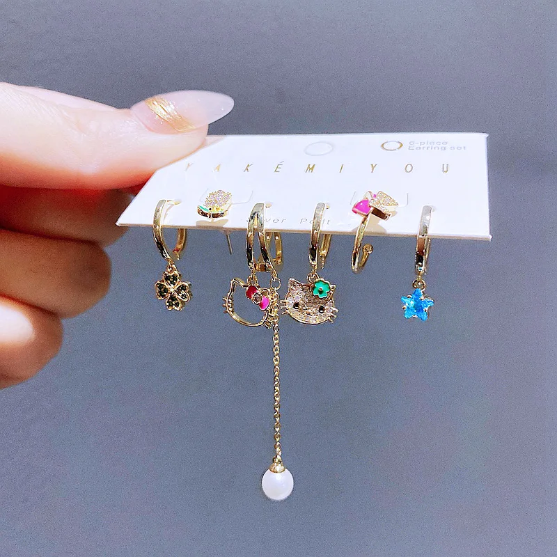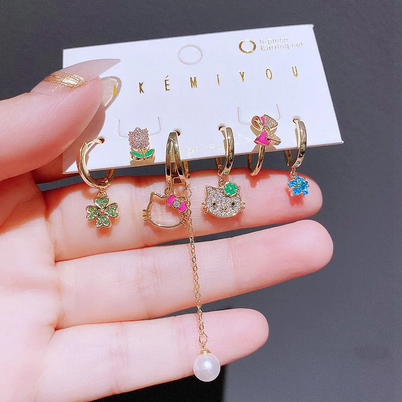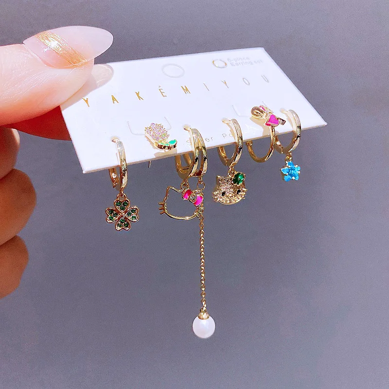 Отзывы о Модные милые серьги-кольца 6 шт. с зеленым кристаллом клевера мультяшным котом