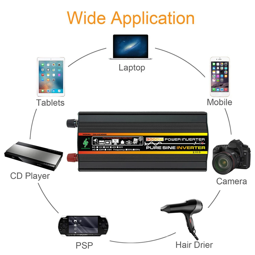 1. Чистая синусоида:Инвертор чистой синусоидальной волны-преобразует 12 В/24 В/48 В/60 В постоянного тока в переменный ток 220 В домашняя настенная мощность с непрерывной выходной мощностью 500 Вт (емкость 3000 Вт) С 1 емкостью переменного тока, один светодиодный дисплей напряжения, клеммы постоянного тока с высоким током и два светодиодный лампы для работы. (Убедитесь, что общая номинальная мощность подключенных устройств ≤ 500 Вт).