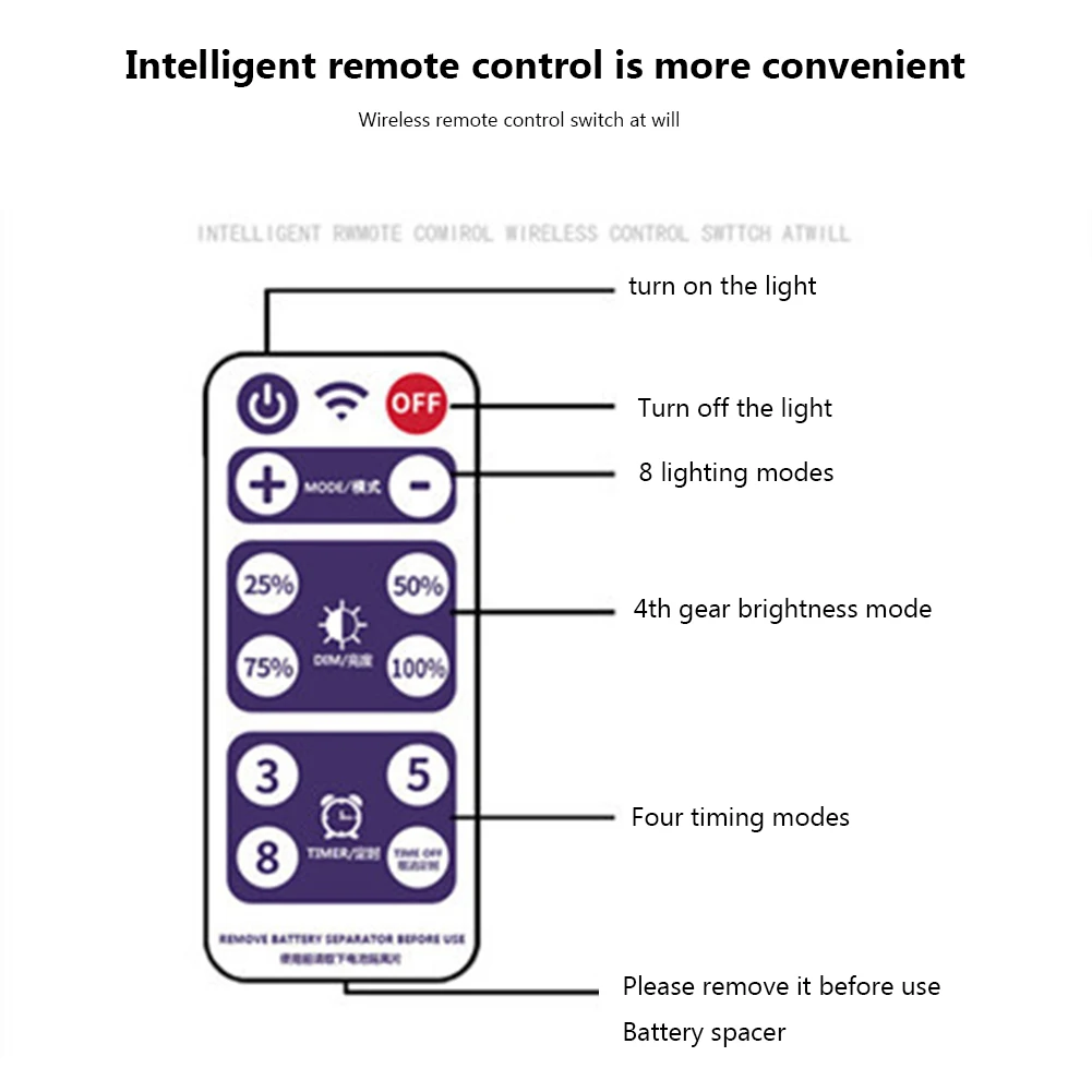 Инструкция: поставляется с батареей и встроенной панелью управления. С пультом дистанционного управления. Режим освещения может быть установлен с помощью пульта дистанционного управления