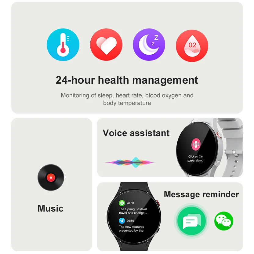 Ежедневные смарт-функции: умные уведомления (звонки, текст, уведомления Gmail и приложение для смартфона), синхронизация погоды (проверка погоды в течение следующих четырех дней), фонарик, управление музыкой и камерой смартфона, поднимите, чтобы проснуться, найдите мой телефон и часы, не беспокойте режимы, оповещение о малоподвижности. Калькулятор, пароль, загрузка приложений, игра.