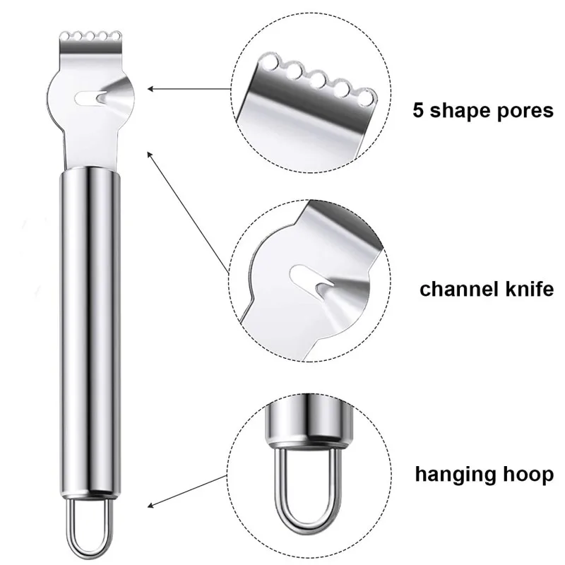 Несколько применений: оранжевый нож для очистки цитрусовых инструментов с 5 плоскими отверстиями на голове может легко удалить изюминку из пика лимонов и других цитрусовых фруктов, встроенный нож делает несколько ЛИМОННЫХ вихрей, красивые изгибы