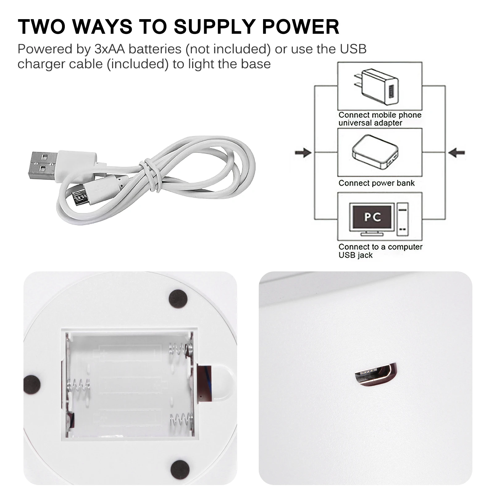 Основание оснащено аккумуляторной коробкой, которая может заряжаться от сухих батарей (не входит в комплект) или подключаться к usb-кабелю для передачи данных. Он очень гибкий и может использоваться даже при отсутствии источника питания.