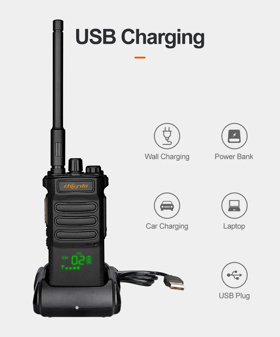 С usb-зарядным основанием, вы можете зарядить свою walkie talkie в любом месте, очень удобно.