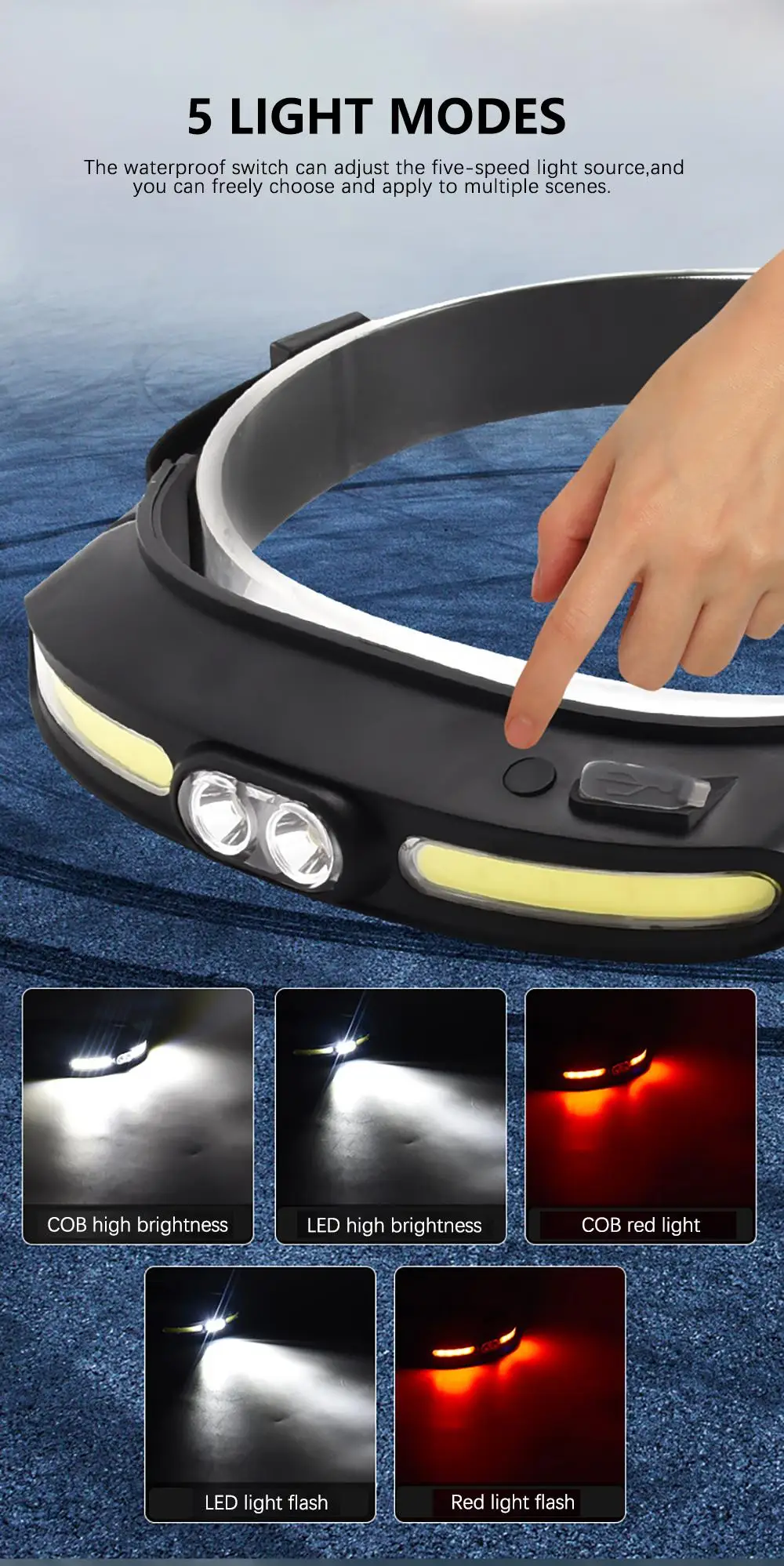 6. Водонепроницаемость: прочный и портативный светодиодный светильник, ударопрочность до 2 метров, надежная в использовании; IPX5 Водонепроницаемый рейтинг, будь то дождь или снег, это идеальный головной светильник для кемпинга, езда на велосипеде, рыбалка и альпинизм.