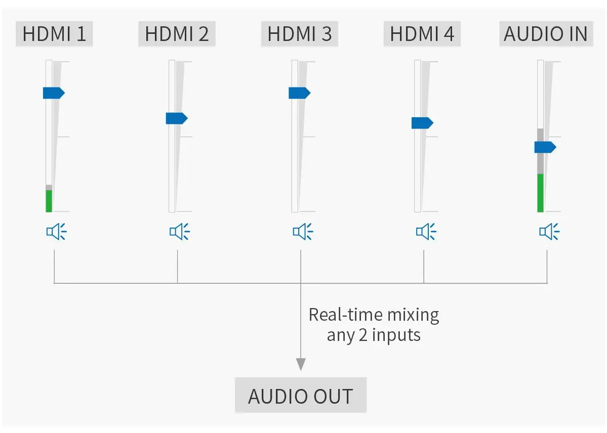 L2 PLUS имеет встроенную функцию смешивания звука, вы можете в режиме реального времени смешивать любые 2 аудиосигнала с 4 входами HDMI и 1 внешним источником звука. Вы также можете подключить внешний аудиомиксер или аудиоинтерфейс для регулировки звукового эффекта, легко обрабатывать различные прямые трансляции.