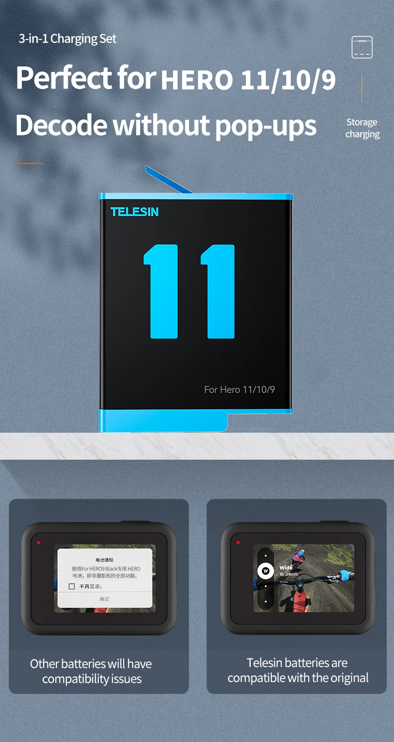 Отзывы о Аккумулятор TELESIN Hero 11 1750 мАч полностью декодированная батарея для GoPro 10 9