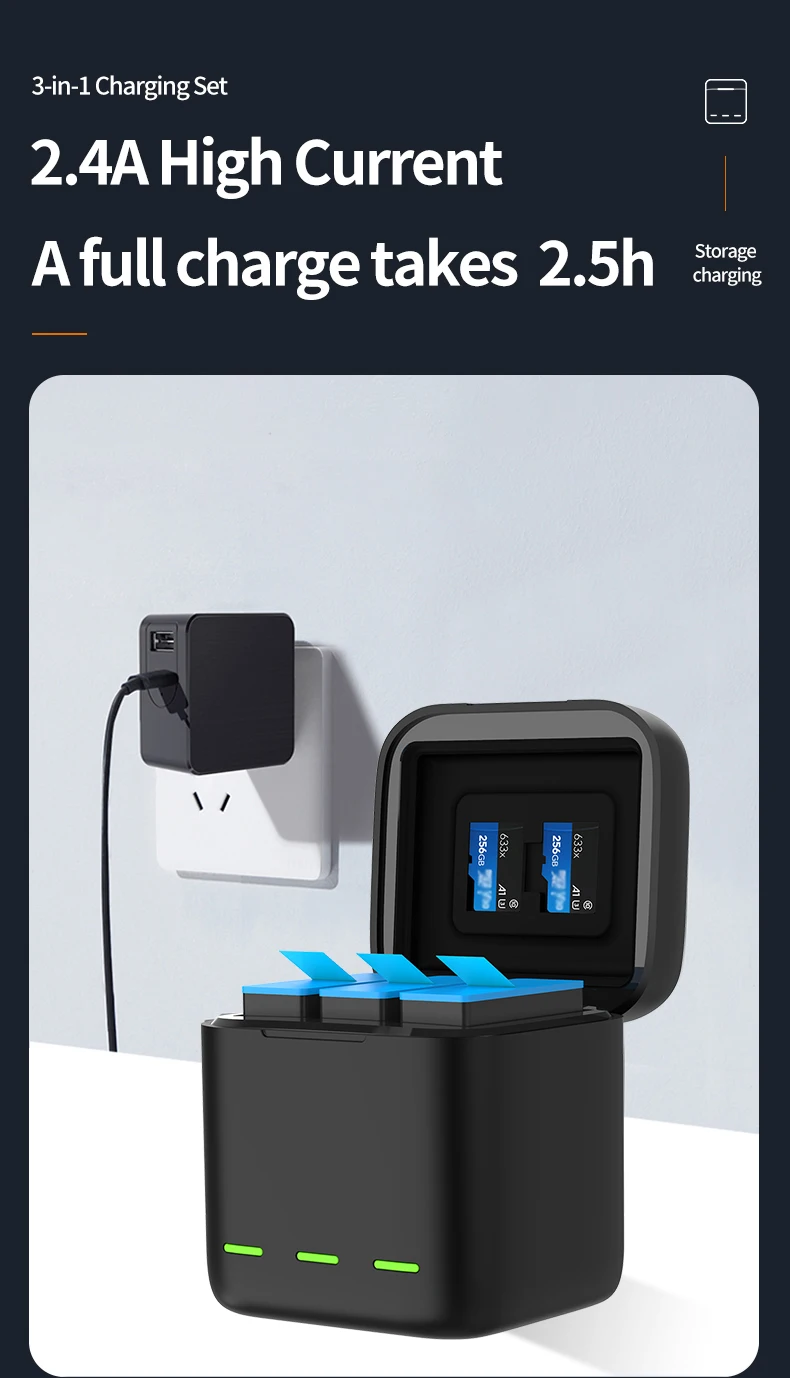 1. Подходит для gopro hero 11/10/9, может заряжать 3 батареи одновременно, поддерживает зарядку оригинального аккумулятора.