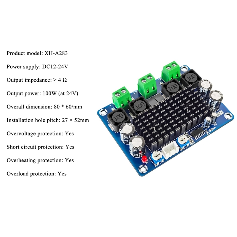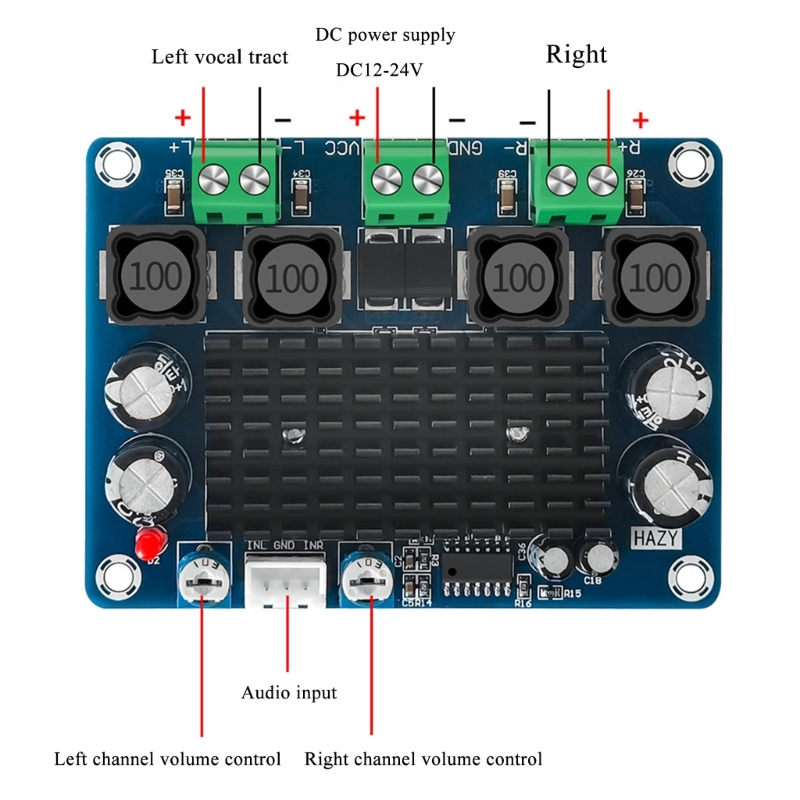 Плата цифрового усилителя управляется широким рабочим напряжением DC12-24V (рекомендуется 24 В) с обратным подключением, и настоятельно рекомендуется для динамиков 4 Ом.