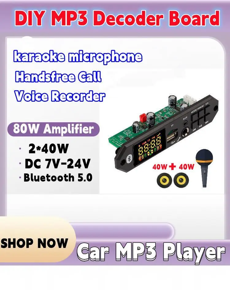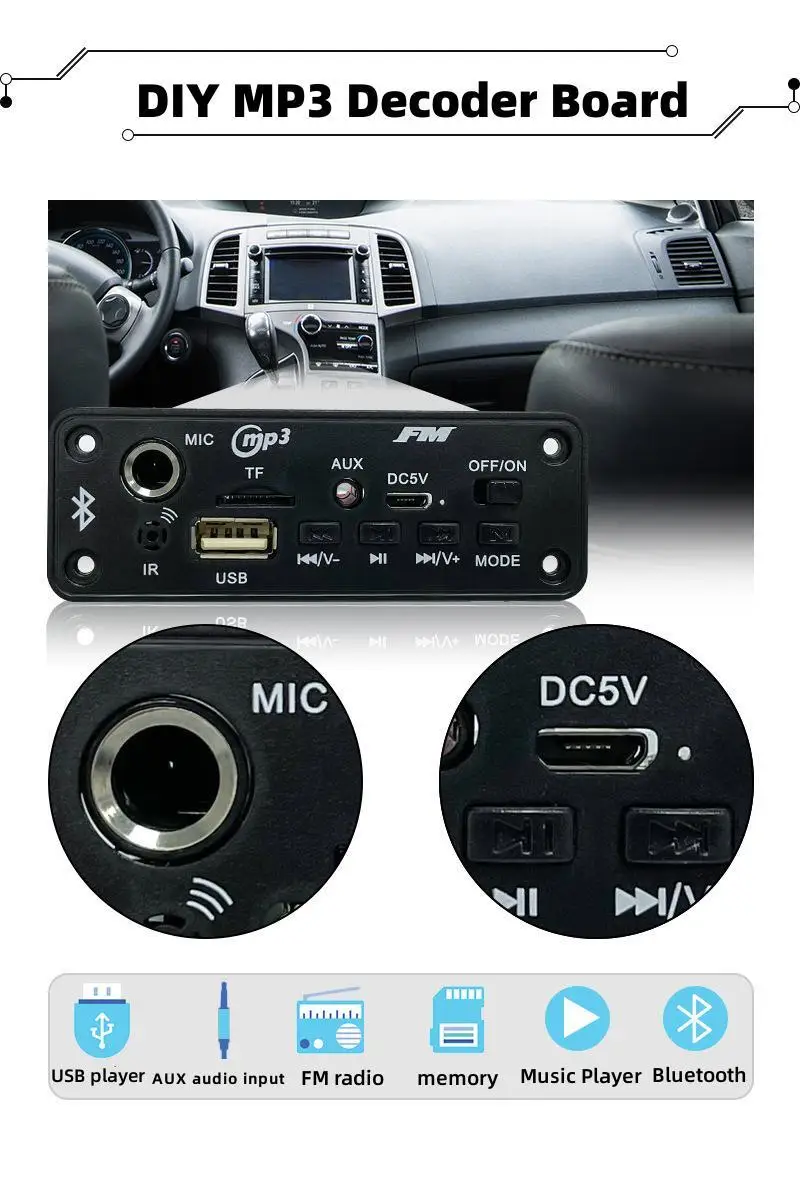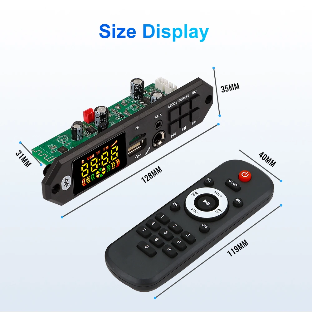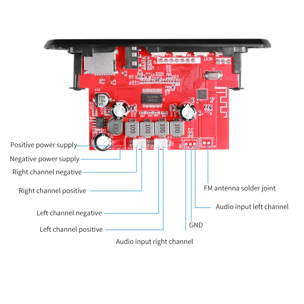 2*5 Вт усилитель постоянного тока 5 ВМодель: JQ-D129BT Функция микрофона Версия Bluetooth 5,0 Напряжение питания: 5 В (диапазон 3,7-5 В) и ток не менее 2 А. Мощность: 2*5 Вт, и два динамика мощностью 5 Вт могут быть подключены одновременно. Подключите функцию микрофона, Функция переключения папок Формат музыки: MP3/WMA/WAV/APE/FLAC музыкальный формат без потерь. Частота радио FM: 87,5-107,5 МГц. Введение функции поддержки: Поддержка MP3/USB/TF/LINE IN/FM/Bluetooth/дистанционного управления/DC 5V. О структуре: Размер панели: 94*35 мм, два угла панели и положение отверстий для винтов, а глубина панели 38 мм. 1. Интерфейс микрофона; 2. ИК: инфракрасный приемный модуль; 3, светодиод: цветной экран, цифровой дисплей красного цвета; 4. USB: Подключите U-диск (максимальная поддержка 32 ГБ); 5. ВЫКЛ/ВКЛ: выключатель питания; 6, VOL-: короткое нажатие для выбора предыдущей песни; Длительное нажатие-Уменьшение громкости; Дважды щелкните, чтобы переключиться на предыдущую папку; 7. AUX: интерфейс аудиовхода; 8. СКАНИРОВАНИЕ: короткое нажатие для переключения между паузой и воспроизведением; В состоянии FM короткое нажатие является автоматической станцией; 9. TF-карта: подключите карту памяти TF (максимальная поддержка 32 ГБ);