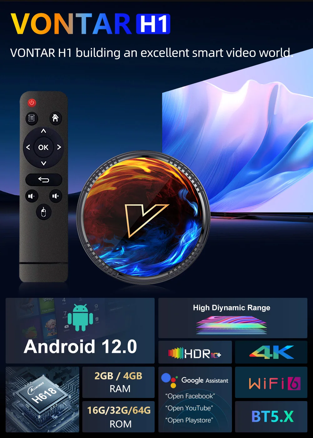 VONTAR H618 Android 12 ТВ коробка с Allwinner H618 четырехъядерный кора головного мозга A53 Поддержка 6K 4K HDR10 + BT5.0 + Wifi6 Google Voice Media Player Декодер каналов кабельного телевидения компьютерной приставки к телевизору H1, 2 Гб оперативной памяти, 16 Гб встроенной памяти, 32 ГБ