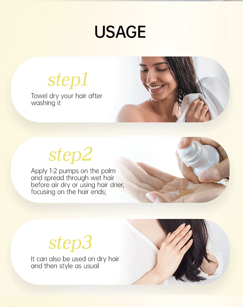 2. Нанесите 1-2 насоса на ладонь и распределите влажные волосы перед высыханием на воздухе или использованием сушилки для волос, ориентируясь на концы волос;