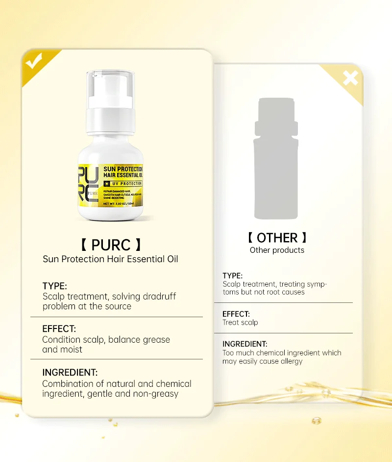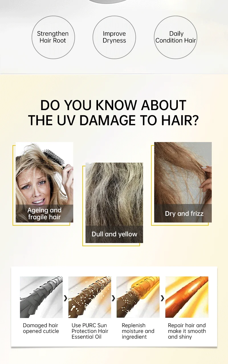 УФ-излучение, особенно летом, удалит влагу и питание ваших волос. Ваши волосы станут сухими, хрупкими или даже выцветшими. Эфирное масло для волос с защитой от солнца-это слегка коллоидная текстура, содержащая олигопептид с гиалуроновой кислотой. При нанесении на волосы, он может немедленно снять влагу, чтобы помочь блокировать питание и увлажнение, восстанавливая волосы от внешнего загрязнения и УФ-повреждений, делая волосы более гладкими и роскошными, но не жирными, защита волос (особенно окрашенных волос) от выцветания.