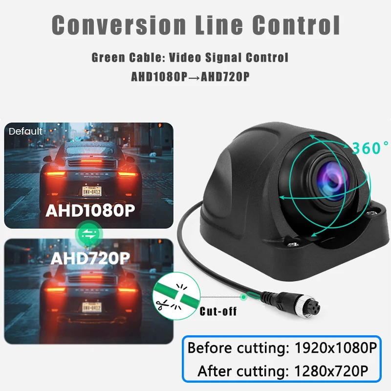 2 в 1 дизайн видеосигнала, легко конвертировать AHD 1080P как 720P, отрезав кабель управления. До резки зеленого кабеля видеосигнал камеры 1920x1080P. После резки зеленого кабеля видео камеры 1280x720P.