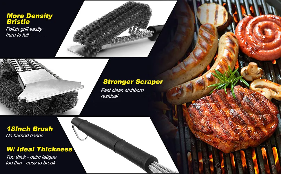 【Легкая очистка 】: состоит из 3 рядов толстых щетин из нержавеющей стали, которые находятся в идеальном балансе между жесткими и гибкими-ни слишком жесткими, так что не вызывают нежелательных царапин, ни легко сглаживать, так что приводит к бесполезности, просто простой поворот, Вы можете тщательно очистить все пятна на 360 ° со всех углов и краев вашего гриля, а не только сверху; Вместе с дополнительным твердым и острым скребком, наполовину Сократить время уборки-это определенно не мечта!