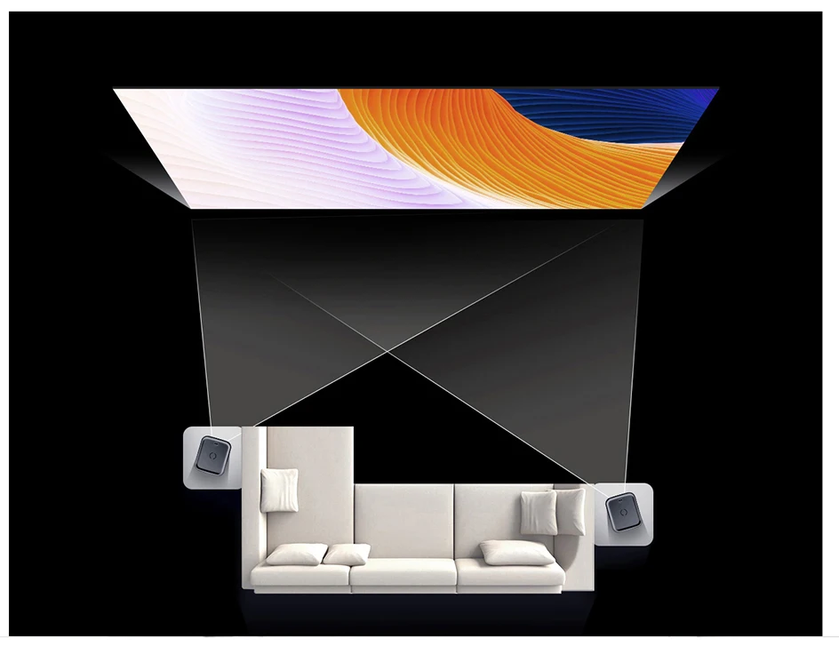 Игнорируя ограничение пространства, функция четырехточечной трапециевидной коррекции + боковая проекция позволяет вам видеть квадратное изображение без облицовки стены для более разнообразных сценариев использования.