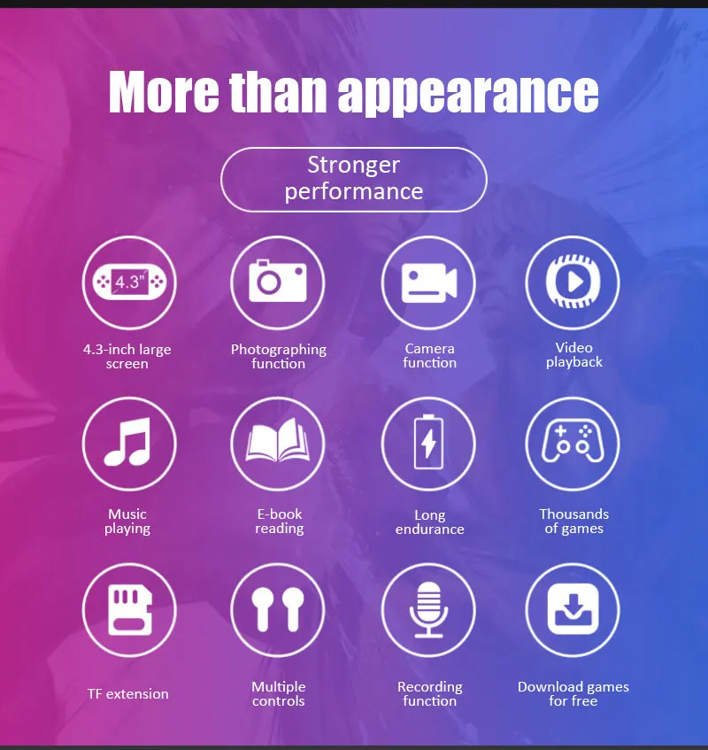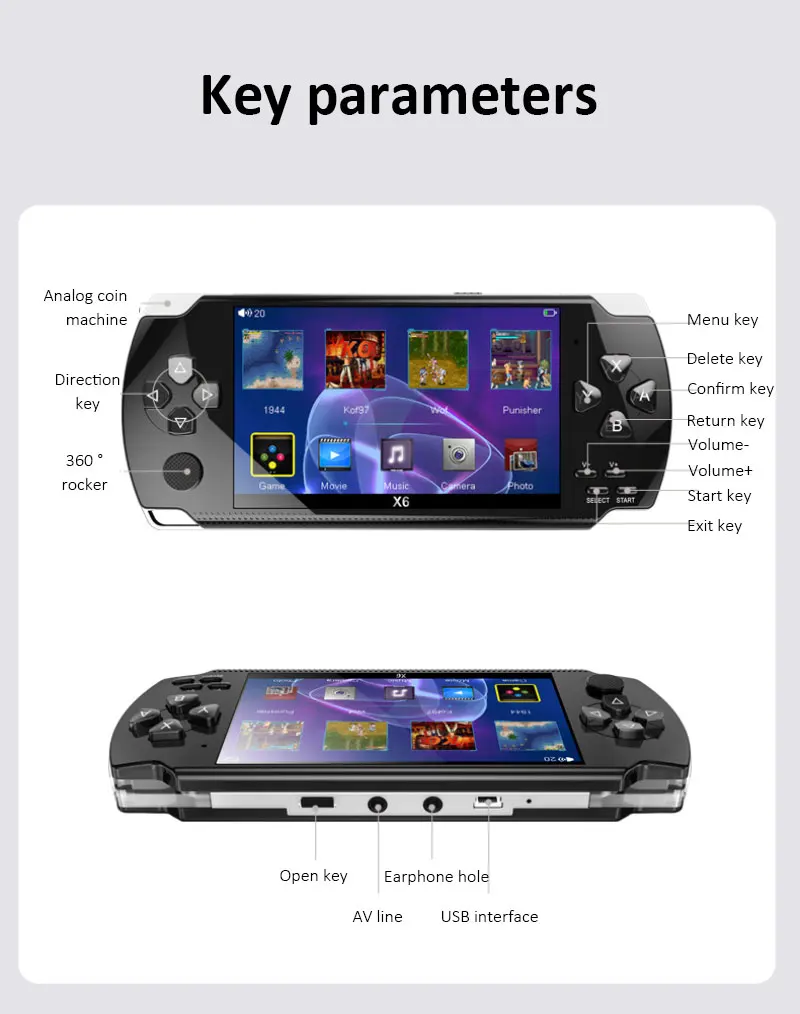 【Screen】 4,0 дюймов классический игровой консоли, поддерживает несколько эмуляторов, игра, может быть эквивалент ко многим предыдущий игровой консоли s, пользователи могут играть много типов игра позволяет легко получить ваши воспоминания о детстве. Он очень подходит для путешествий, дома, улицы, отдыха, а также подходит в качестве подарка.