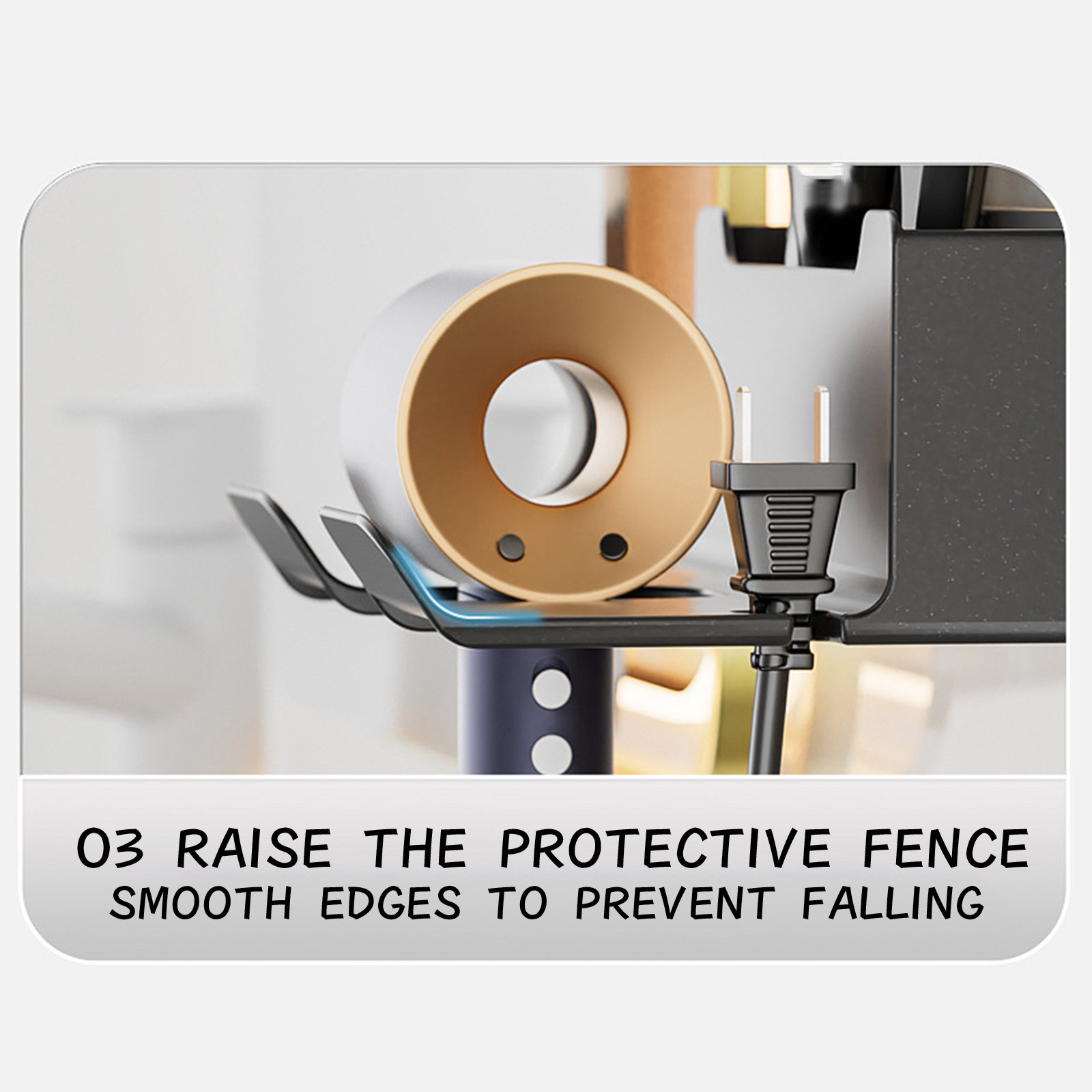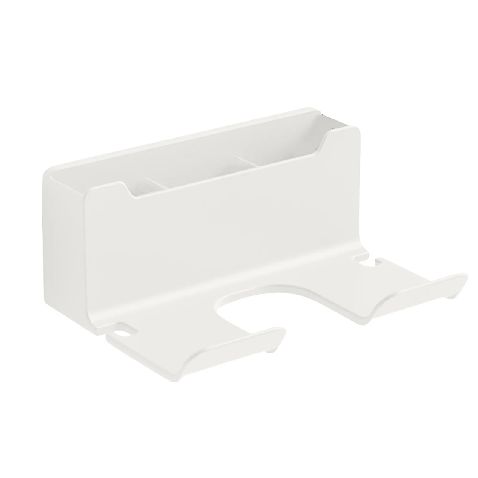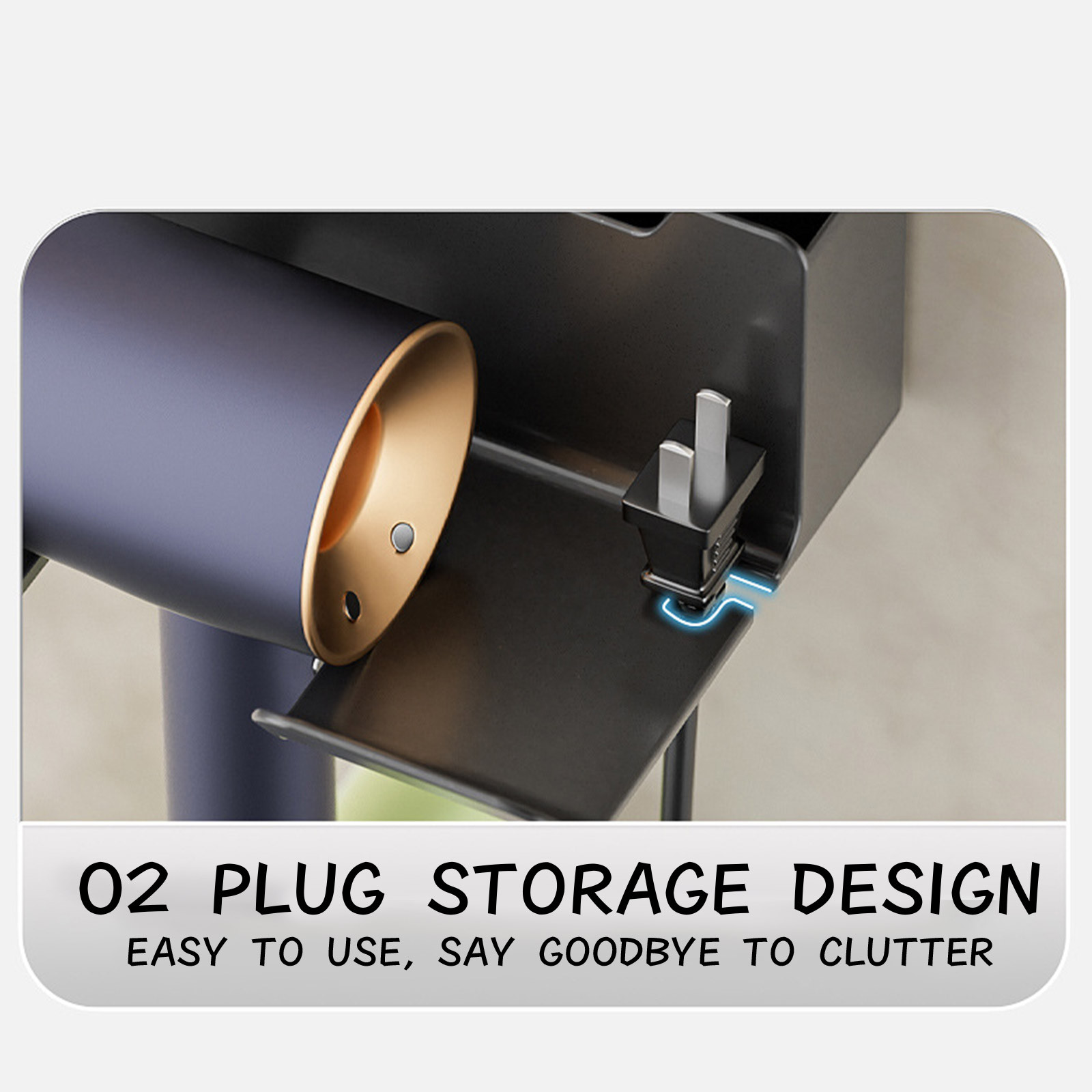 Благодаря зажиму для подключения шнура эта стойка для фена предотвращает запутывание шнура питания и экономит место на стойке для ванной комнаты.