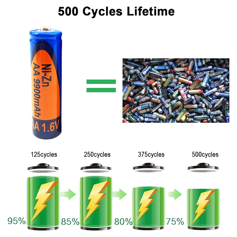 5. Энергия Ni-Zn батареи на 30% выше, чем у стандартной аккумуляторной батареи (NiMH/NiCd). Номинальной стоимостью никель-цинковая батарея 1,6 V, что на 30% выше, чем (номинальный 1,2 V). Когда он полностью заряжен, ваш терминал напряжения включает идеальное напряжение 1,85 в!