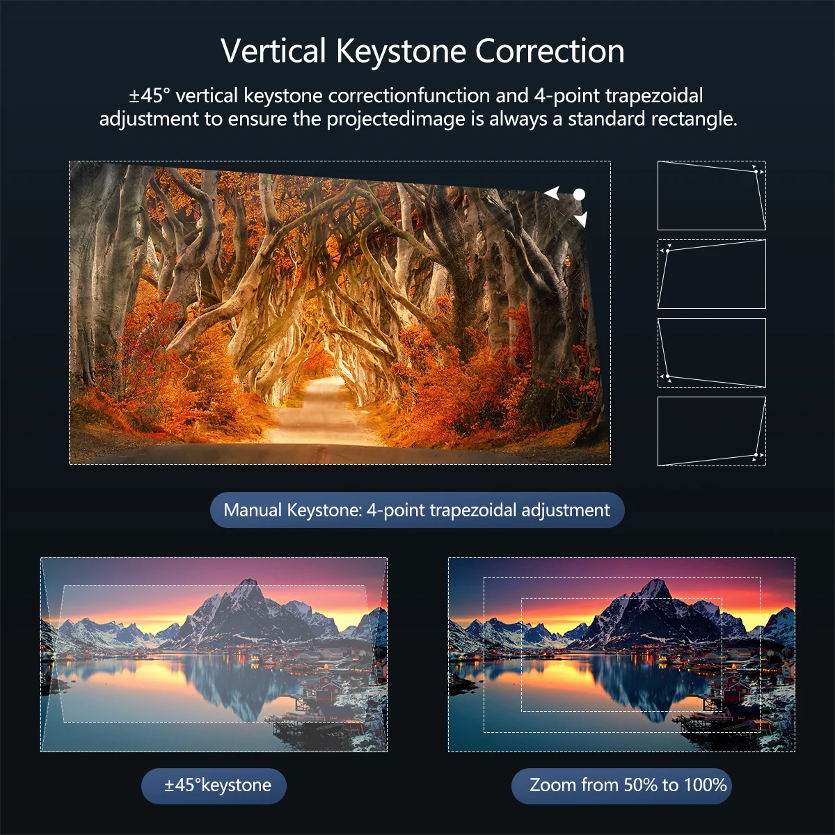 【 12 】Keystone коррекция: ± 45 °, поддерживает 4-точечный коррекция трапецеидальных искажений