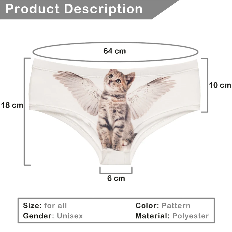 Трусики с принтом трусы Высокое качество, пожалуйста, будьте уверены в покупке Размеры: Бесплатная Измерьте вручную, пожалуйста, сообщите об ошибке 0,5-1 см. Спасибо! Цвет: cat трусики Материал: полиэстер Примечание: Из-за разницы между различными мониторами картинка может не отражать Актуальный цвет товара мы гарантируем стиль такой же, как показано в картинках, На других моделях может выглядеть по-другому.