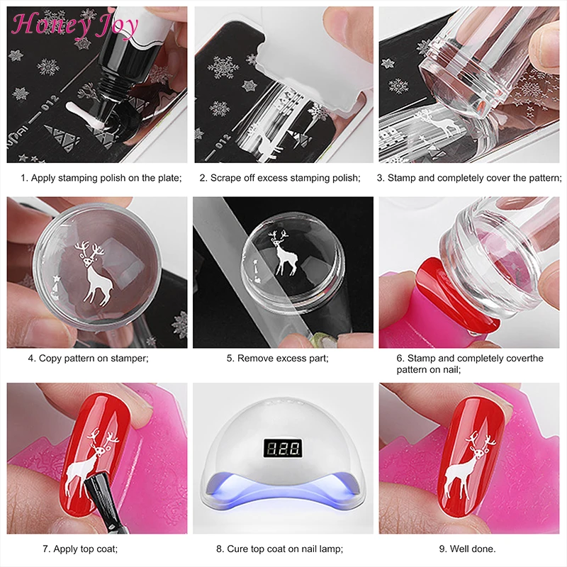 (Примечание: Из-за различного качества лака для ногтей, некоторые лаки для ногтей не подходят для штамповки, поэтому, пожалуйста, выберите правильный лак для ногтей, И если в первый раз вы не можете переносить дизайн на штамп, пожалуйста, повторите попытку. Спасибо.)