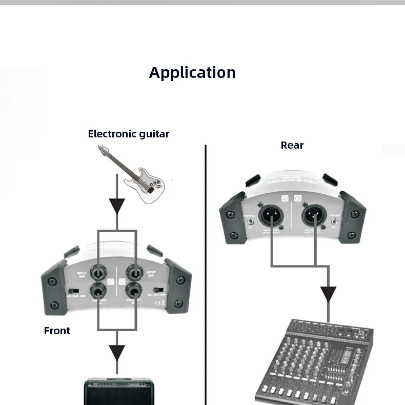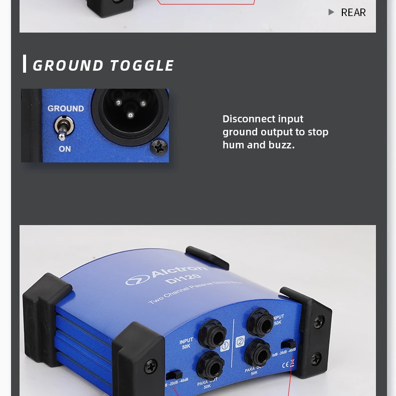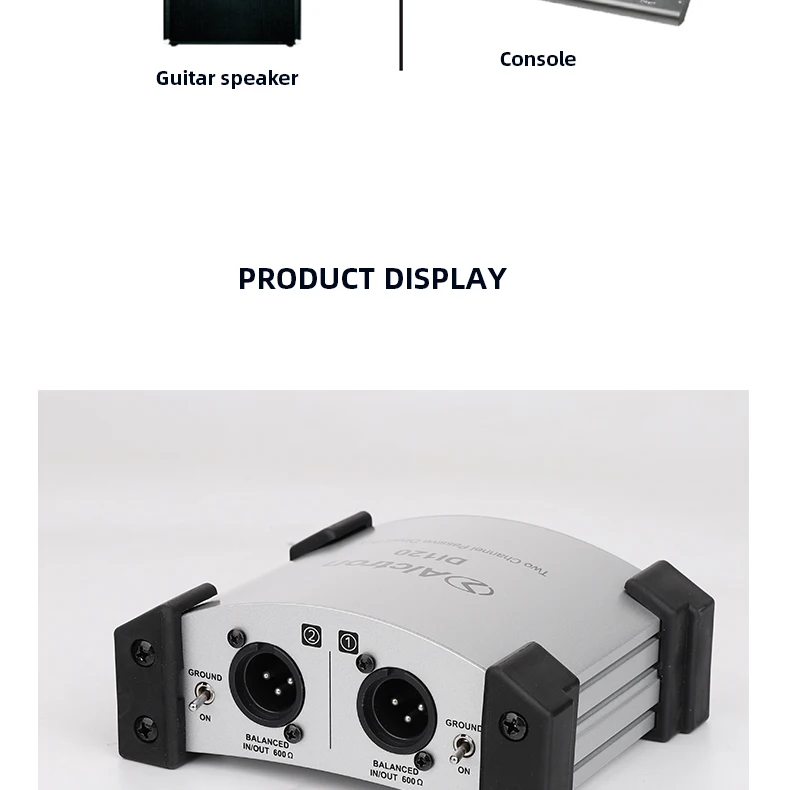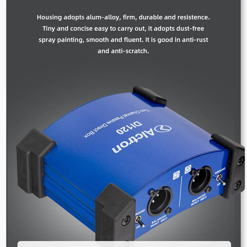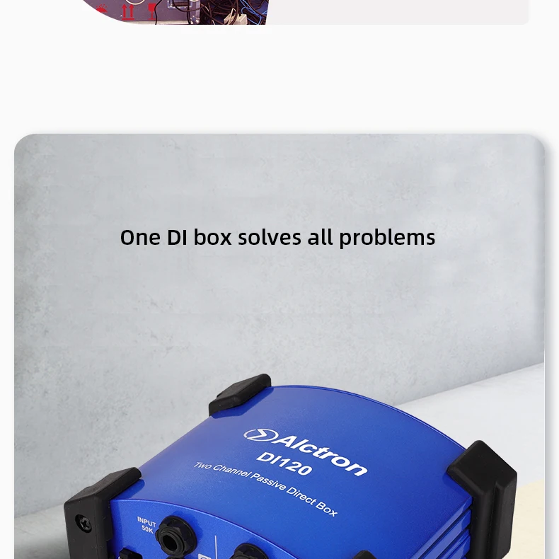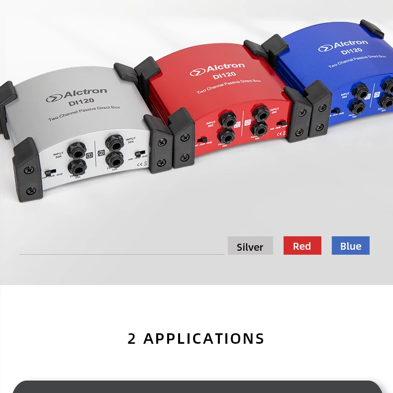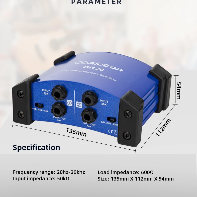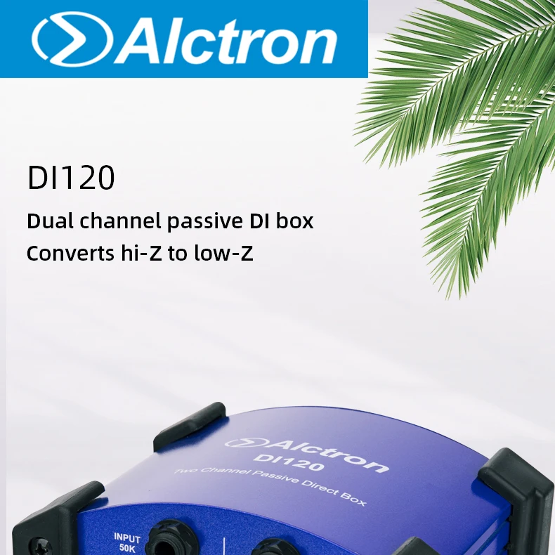 Alctron DI120 пассивный стерео DI прямая коробкаКоробка DI используется, когда у вас есть несимметричный, высокоимпедансный инструмент, такой как гитара или клавиатура, и вы хотите подключить его к сбалансированному входу микрофона XLR. Важно для сценических работников, которые должны подключаться к сбалансированным XLR многократным сценическим коробкам.ТоварыУстройство оснащено двумя входами, выходами связи для подключения к сценическим усилителям во время отправки сигнала на стол смешивания, выбор двух настроек полки для демпфирования горячих сигналов и переключателя наземного подъема для каждого канала. Это универсальная коробка DI, подходящая для профессионального использования.Особенности:Частотная характеристика: 10 Гц-25 кГцУровень шума (22 Гц-22 кГц, вход коротковат) : -100dBuВход: два 1/4 "разъемы для телефона, несимметричныйВыход: два разъема XLR, сбалансированныйВыходная связь: два 1/4 "разъемы для телефона, несимметричныеПереключатель PAD: 0 дБ, -20 дБ, -40 дБ Настройка/Два переключателяРазмеры: 135x114x47.5Вес:Два переключателя наземного подъемаРезиновый коврик для ног