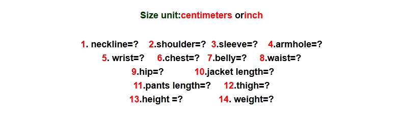 1. Вырез =? 2. Плечо =? 3. Рукав =? 4. Пройма =? 5. Запястье =? 6. Грудь =? 7. Живот =? 8. Талия =? 9. Бедра =? 10. Длина куртки =? 11. Штаны длина =? 12. Бедро =? 13. Высота =? 14. Вес =?