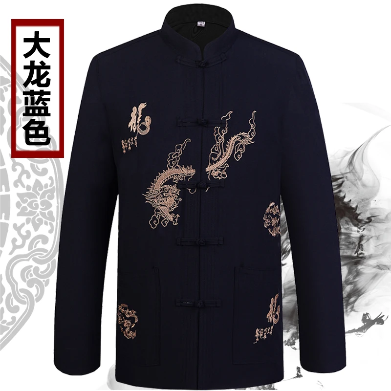 Новинка 2017, мужской национальный костюм Тан с воротником-стойкой, китайская фигура дракона, рубашка с длинными рукавами среднего возраста, одежда для ушу на весну и осень