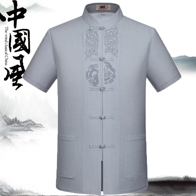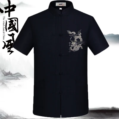 Новый мужской костюм с вышивкой в виде китайского дракона, рубашка с коротким рукавом, традиционная летняя художественная футболка в стиле кунгфу